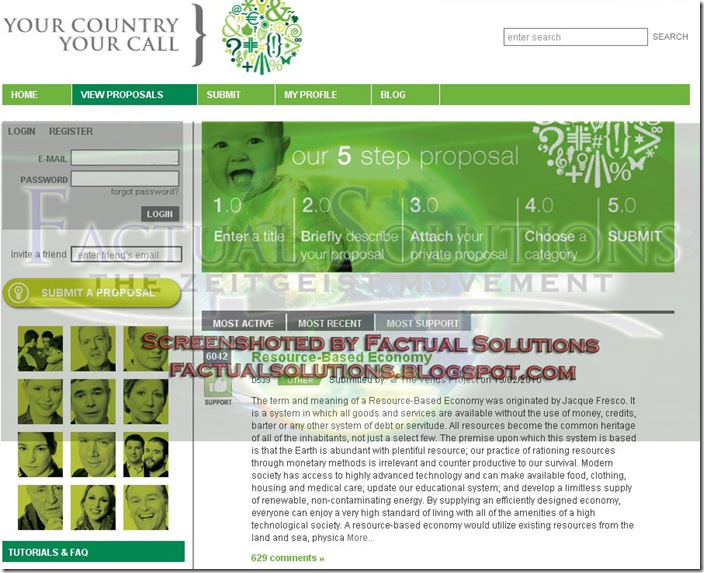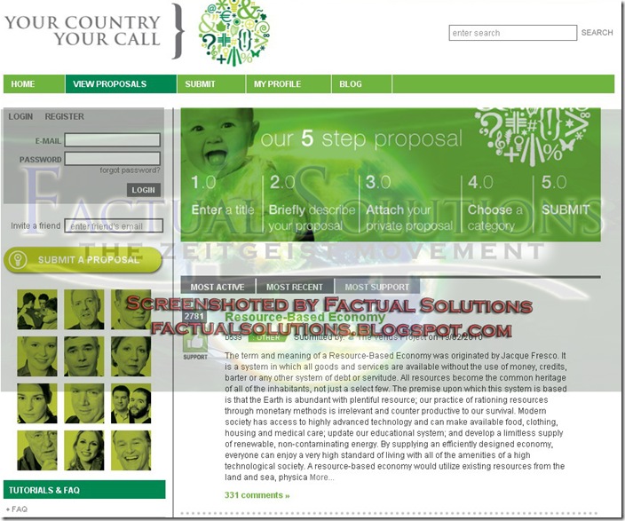 A Resource Based Economy (RBE) Proposal was submitted on (Feb 19, 2010) by Paul Clarke and was accepted. In about 1 month's time, there were over 8,300 supports of this proposal. There was about 1,000 comments for this proposal. The last comment was made at 11:15am on March 22, 2010. The second place proposal as of 3PM March 22, 2010 only has 792 supporters. As of today, March 22, 2010, yourcountryyourcall removed the RBE proposal without any reason or explanation.